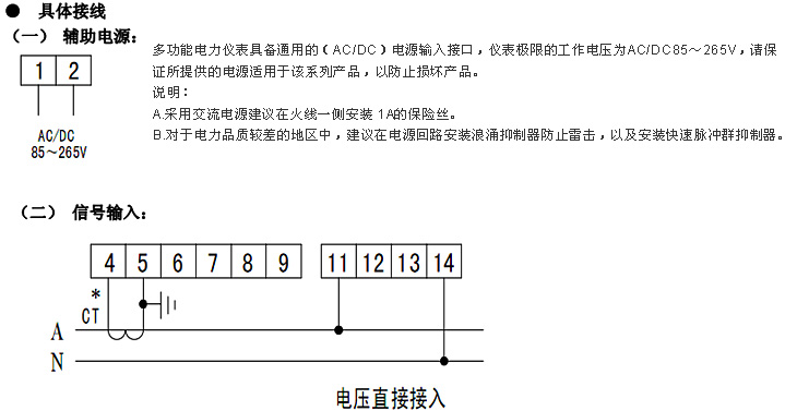 | 注:正确接线是仪表正确使用的步,注意外加的辅助电源和输入信号同所订购的仪表的型号相匹配(如辅助电源电压不要超过 265V,对于 6kV/100V 的仪表不要当作 AC400V 来使用),接线的位置要正确,特别要注意强电信号不要接在弱电信号上(如通讯、脉冲输出等),另外要特别注意输入的电压、电流信号的极性要正确,当输入信号的极性不正确会导致电压、电流测量数据正确而功率不对,从而导致电能的计量不正确,所以务必注意仪表的接线。 |