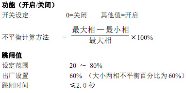 ——保护器根据小相电流和相电流的比值判断是否越限来判断是否需要保护动作。当任何两相间的电流比值大于跳闸值并持续一定时间(即跳闸时间),如果在跳闸时间内仍未恢复,保护器执行跳闸命令,同时操作面板上显示三相电流不平衡跳闸信息。