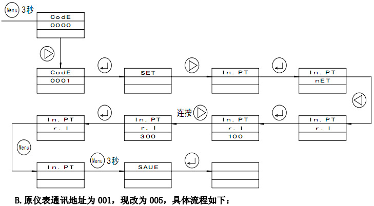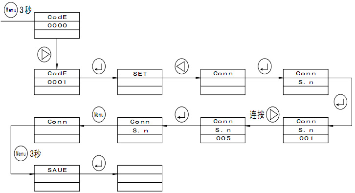 ④ 编程结束后,仪表会显示“SAUE”询问是否存盘,若按“ ”键表示存盘退出,若按“Menu”