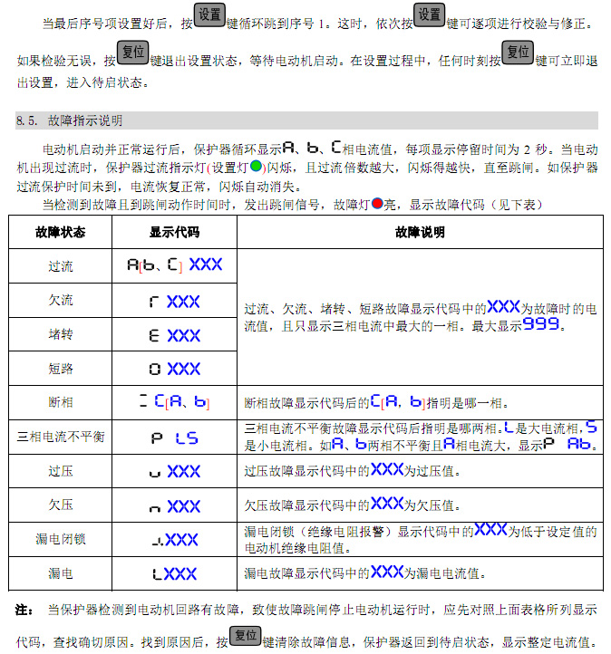 注 1.第 1设置项为整定电流值,是用户必须设置项,建议设定为电动机铭牌额定电流值的 0.9倍左右(首先须选择合适电流规格的保护器,如 10~40A电动机选择 50A 规格保护器) 。