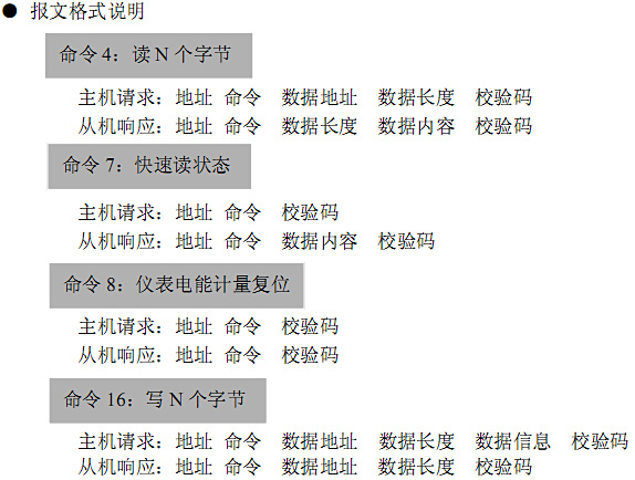 说明:从数据地址表知,电流参数地址为 36(0024H) ,需要读的数据为 3×4 个BYTE 电量数据,数据长度为 000CH,回送的电量数据IA 为BYTE11,BYTE12,BYTE13,BYTE14,IB 为BYTE21,BYTE22,BYTE23,BYTE24,……其意义满足 IEEE-754浮点数格式数据规范。