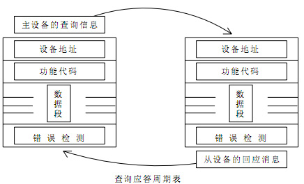 主机查询:查询消息帧包括设备地址码、功能代码、数据信息码、校准码。地址码表明要选中的从机设备;功能代码告之被选中的从设备要执行何种功能,例如功能代码 04 是要求从设备读寄存器并返回它们 的内容;数据段包含了从设备要执行功能的任何附加信息,如在读命令中,数据段的附加信息有从何寄存器开始读及要读的寄存器数量;校验码用来检验一帧信息的正确性,从设备提供了一种验证消息内容是否正确的方法,它采用 CRC16 的校准规则。