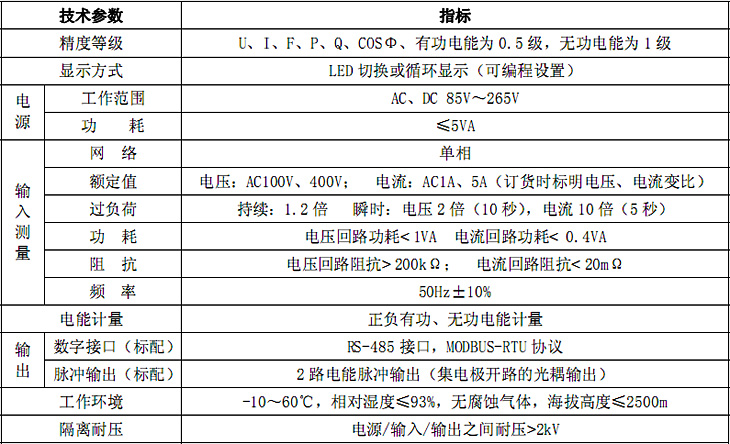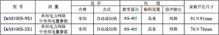 DeM100S-9S1、DeM100S-3S1 是集测量、显示、数字通讯和电能脉冲输出等功能于一体的单相多功能电力仪表,能够完成电量测量、电能计量、数据显示、采集及传输,可广泛应用变电站自动化、配电自动化、智能建筑、企业内部电能测量、管理、考核。测量精度为 0.5 级,实现 LED 现场显示和远程 RS-485数字接口通讯、采用 MODBUS-RTU通讯协议